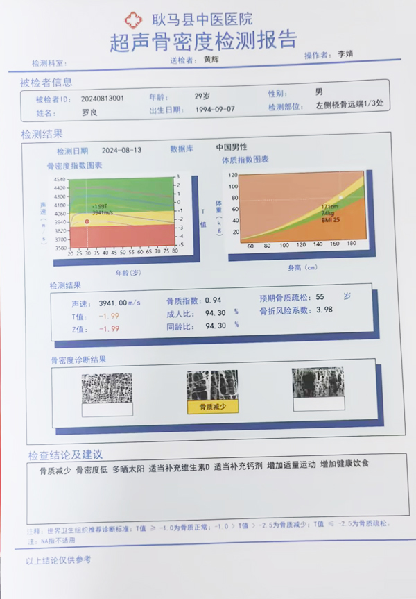 骨密度檢測是評估骨骼健康狀況的重要方法,對于早期發現骨質疏松、預測骨折風險、監測治療效果等具有重要意義。以往,患者需要前往上級醫院或專業機構進行骨密度檢測,不僅費時費力,還可能延誤病情。此次耿馬縣中醫醫院引進的品源醫療超聲骨密度檢測儀,具備多部位測量(橈骨、脛骨)和多傳感器探頭的技術優勢,能夠實現對不同年齡段人群的全面檢測。其內置的少年兒童數據庫(0-12歲)、青少年數據庫(12-20歲)、成年人數據庫(20-80歲)、老年人數據庫(80-100歲),使得檢測結果更加貼合不同人群的實際情況。