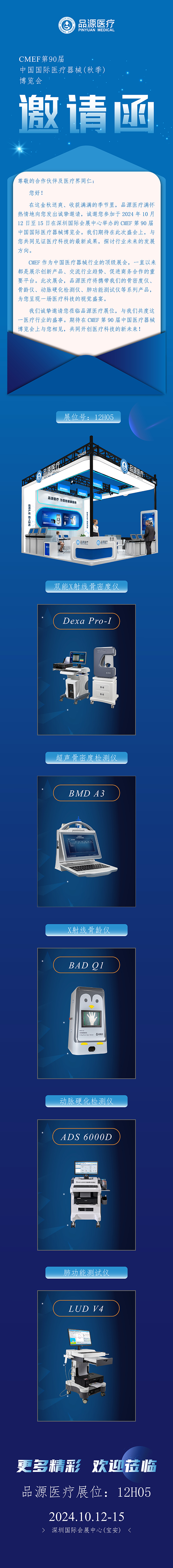 CMEF 作為中國(guó)醫(yī)療器械行業(yè)的頂級(jí)展會(huì),一直以來(lái)都是展示創(chuàng)新產(chǎn)品、交流行業(yè)趨勢(shì)、促進(jìn)商務(wù)合作的重要平臺(tái)。此次展會(huì),品源醫(yī)療將攜帶我們的骨密度儀、骨齡儀、動(dòng)脈硬化檢測(cè)儀、肺功能測(cè)試儀等系列產(chǎn)品,為您呈現(xiàn)一場(chǎng)醫(yī)療科技的視覺(jué)盛宴。我們誠(chéng)摯邀請(qǐng)您蒞臨品源醫(yī)療展位12H05,與我們共度這一醫(yī)療行業(yè)的盛事。期待在 CMEF 第 90 屆中國(guó)醫(yī)療器械博覽會(huì)上與您相見(jiàn),共同開(kāi)創(chuàng)醫(yī)療科技的新未來(lái)!